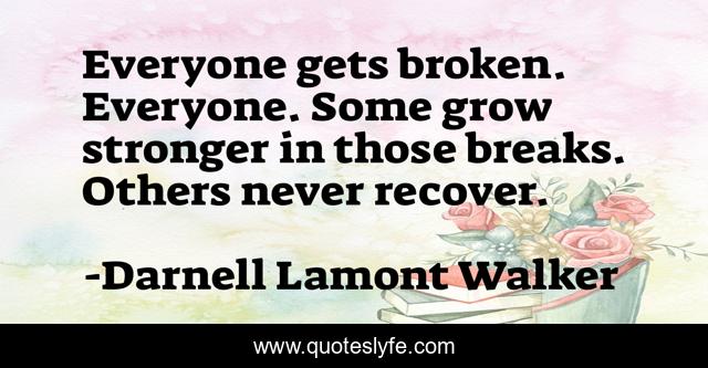 This page presents the quote "Everyone gets broken. Everyone. Some grow stronger in those breaks. Others never recover.". Author of this quote is Darnell Lamont Walker. This quote is about broken, pain, hurt,.
