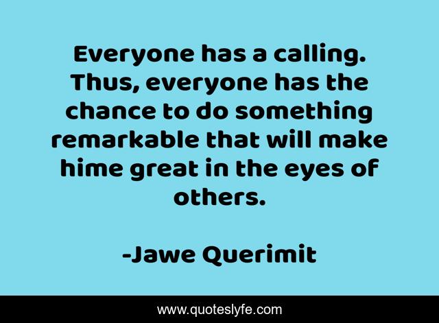 This page presents the quote "Everyone has a calling. Thus, everyone has the chance to do something remarkable that will make hime great in the eyes of others.". Author of this quote is Jawe Querimit. .