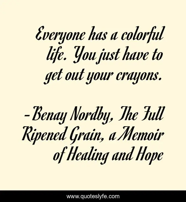 "Benay Nordby, The Full Ripened Grain, a Memoir of Healing and Hope Quotes." Quoteslyfe.com, 2025. Mon. 08 Dec. 2025. <https://www.quoteslyfe.com/quote/Everyone-has-a-colorful-life-You-just-204428>.