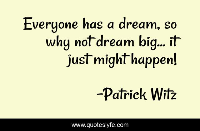 This page presents the quote "Everyone has a dream, so why not dream big... it just might happen!". Author of this quote is Patrick Witz. This quote is about everyone-has-a-dream, dream-big, it-just-might-happen,.