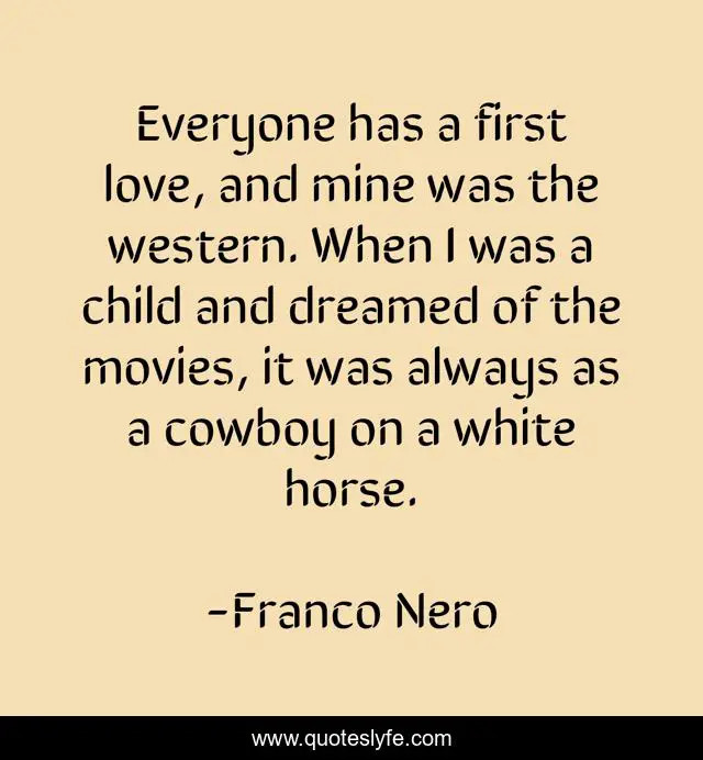 This page presents the quote "Everyone has a first love, and mine was the western. When I was a child and dreamed of the movies, it was always as a cowboy on a white horse.". Author of this quote is Franco Nero. This quote is about horse, love, affection, child,.