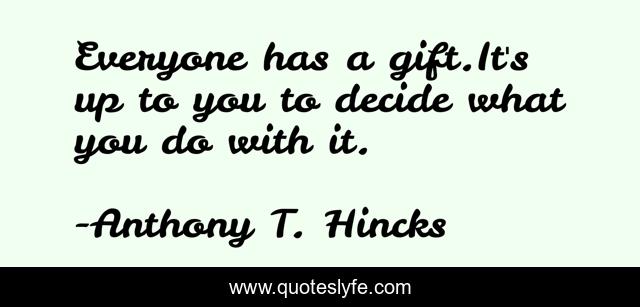 This page presents the quote "Everyone has a gift.It's up to you to decide what you do with it.". Author of this quote is Anthony T. Hincks. This quote is about everyone, decide, gift, philosophy, it, have, has, with,.
