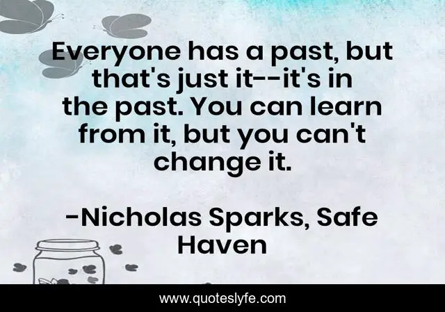 This page presents the quote "Everyone has a past, but that's just it--it's in the past. You can learn from it, but you can't change it.". Author of this quote is Nicholas Sparks, Safe Haven. This quote is about past, life, love, nicholas-sparks, affection,.