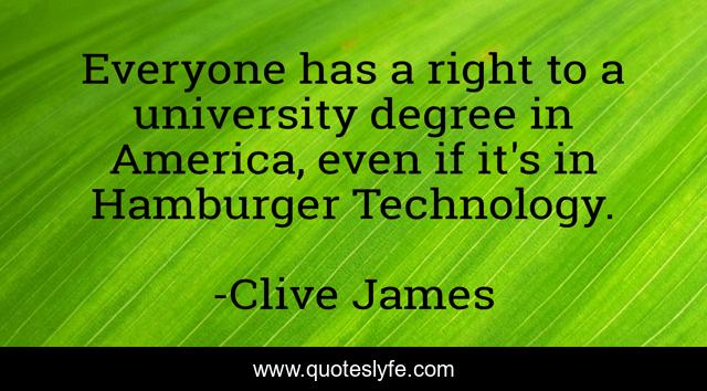 This page presents the quote "Everyone has a right to a university degree in America, even if it's in Hamburger Technology.". Author of this quote is Clive James. This quote is about america, technology, right,.