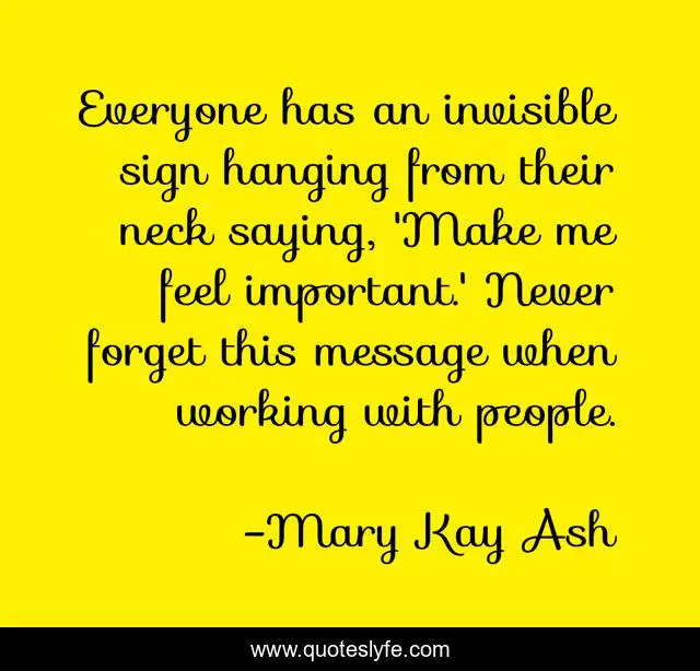 This page presents the quote "Everyone has an invisible sign hanging from their neck saying, 'Make me feel important.' Never forget this message when working with people.". Author of this quote is Mary Kay Ash. This quote is about me, never forget, people,.