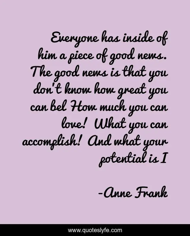 This page presents the quote "Everyone has inside of him a piece of good news. The good news is that you don't know how great you can bel How much you can love! What you can accomplish! And what your potential is I". Author of this quote is Anne Frank. .