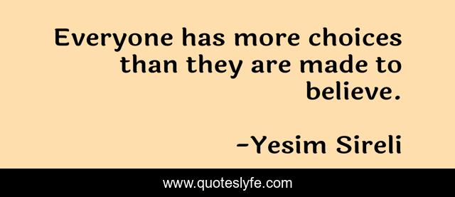 This page presents the quote "Everyone has more choices than they are made to believe.". Author of this quote is Yesim Sireli. This quote is about life, choices,.