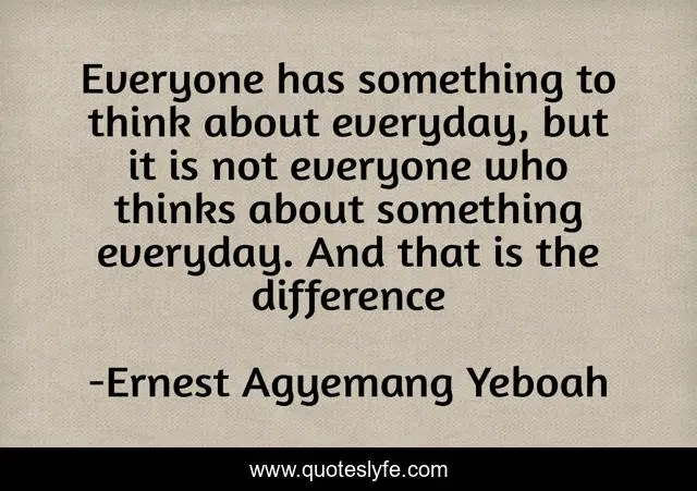 This page presents the quote "Everyone has something to think about everyday, but it is not everyone who thinks about something everyday. And that is the difference". Author of this quote is Ernest Agyemang Yeboah. This quote is about brainy, reasons, differences, wisdom, psyche, everyone, purpose, purpose-driven-life, brainyquote,.
