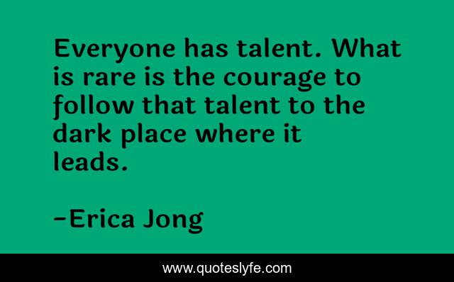 This page presents the quote "Everyone has talent. What is rare is the courage to follow that talent to the dark place where it leads.". Author of this quote is Erica Jong. .