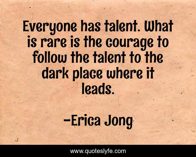 This page presents the quote "Everyone has talent. What is rare is the courage to follow the talent to the dark place where it leads.". Author of this quote is Erica Jong. This quote is about dark, talent, place,.