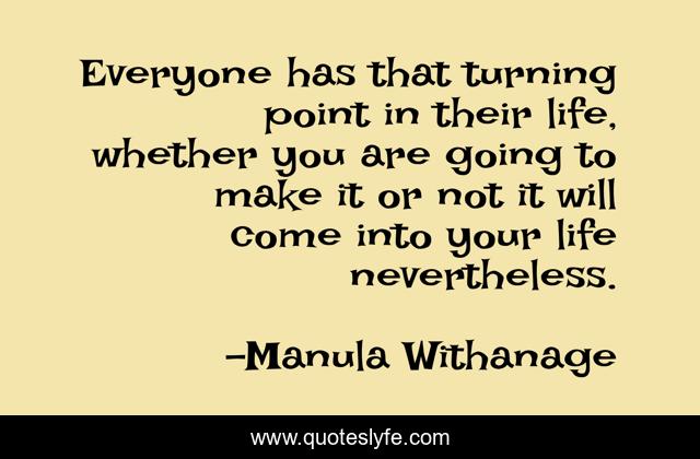 This page presents the quote "Everyone has that turning point in their life, whether you are going to make it or not it will come into your life nevertheless.". Author of this quote is Manula Withanage. This quote is about life, positive, motivational, confidence, experience-inspiration, life-lessons, optimistic,.