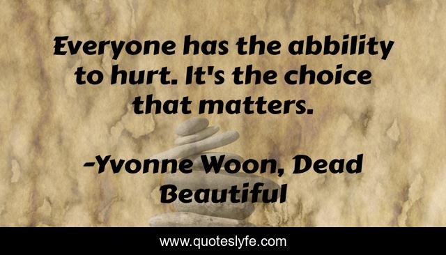 This page presents the quote "Everyone has the abbility to hurt. It's the choice that matters.". Author of this quote is Yvonne Woon, Dead Beautiful. This quote is about hurting, options, choice,.