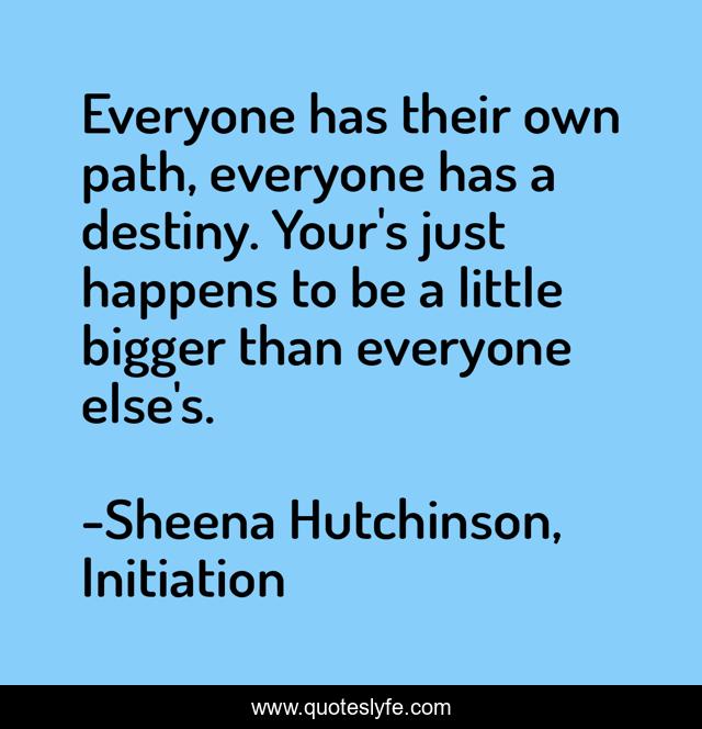This page presents the quote "Everyone has their own path, everyone has a destiny. Your's just happens to be a little bigger than everyone else's.". Author of this quote is Sheena Hutchinson, Initiation. This quote is about enthusiasm, seraphina, fate, destiny, inspirational,.