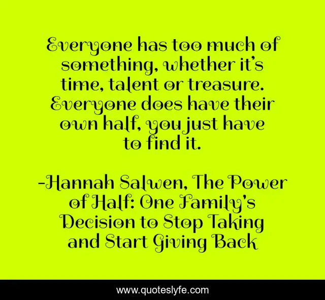 "Hannah Salwen, The Power of Half: One Family's Decision to Stop Taking and Start Giving Back Quotes." Quoteslyfe.com, 2025. Fri. 05 Dec. 2025. <https://www.quoteslyfe.com/quote/Everyone-has-too-much-of-something-whether-36179>.