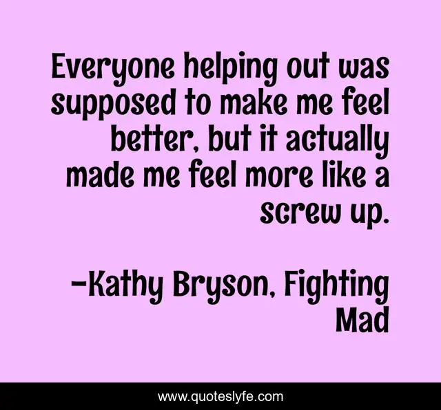 This page presents the quote "Everyone helping out was supposed to make me feel better, but it actually made me feel more like a screw up.". Author of this quote is Kathy Bryson, Fighting Mad. This quote is about leprechauns, humor, fairies, romance, fantasy, fighting-mad,.
