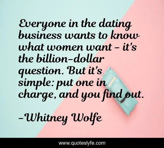 This page presents the quote "Everyone in the dating business wants to know what women want - it's the billion-dollar question. But it's simple: put one in charge, and you find out.". Author of this quote is Whitney Wolfe. This quote is about simple, business, women,.