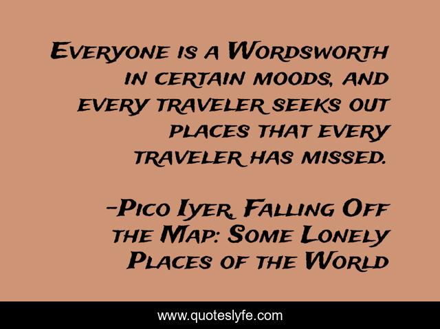 This page presents the quote "Everyone is a Wordsworth in certain moods, and every traveler seeks out places that every traveler has missed.". Author of this quote is Pico Iyer, Falling Off the Map: Some Lonely Places of the World. This quote is about travel, wordsworth,.