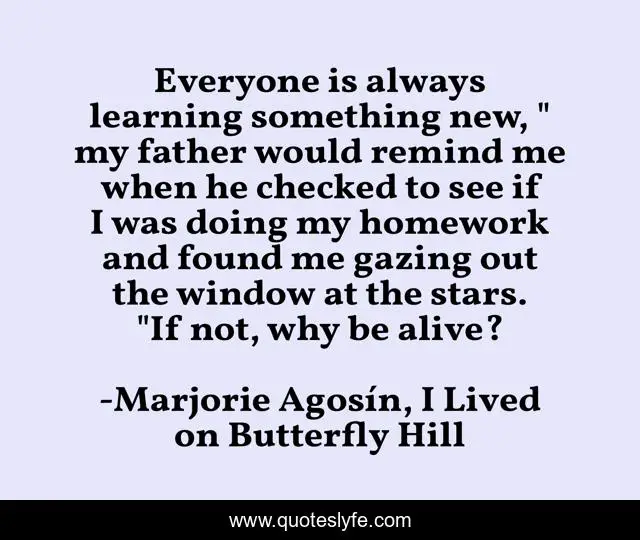This page presents the quote "Everyone is always learning something new, " my father would remind me when he checked to see if I was doing my homework and found me gazing out the window at the stars. "If not, why be alive?". Author of this quote is Marjorie Agosín, I Lived on Butterfly Hill. .