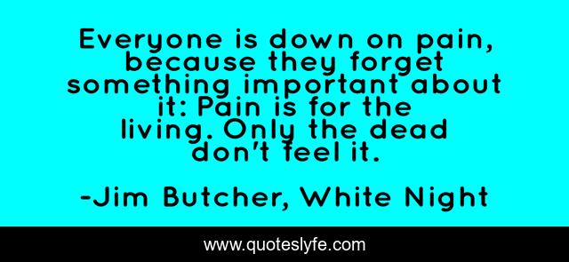 This page presents the quote "Everyone is down on pain, because they forget something important about it: Pain is for the living. Only the dead don't feel it.". Author of this quote is Jim Butcher, White Night. This quote is about dresden, life, pain, wisdom,.