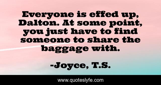 This page presents the quote "Everyone is effed up, Dalton. At some point, you just have to find someone to share the baggage with.". Author of this quote is Joyce, T.S.. This quote is about inspirational-attitude, erotic-romance, shifter-romance, self-help,.
