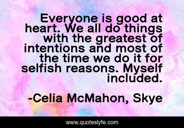 This page presents the quote "Everyone is good at heart. We all do things with the greatest of intentions and most of the time we do it for selfish reasons. Myself included.". Author of this quote is Celia McMahon, Skye. This quote is about selfish, intentions, good, heart,.
