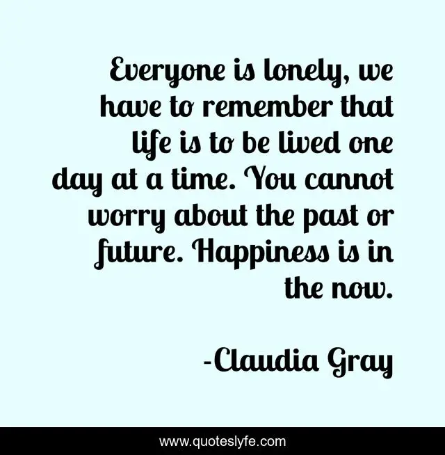 This page presents the quote "Everyone is lonely, we have to remember that life is to be lived one day at a time. You cannot worry about the past or future. Happiness is in the now.". Author of this quote is Claudia Gray. This quote is about enthusiasm, life, inspirational,.