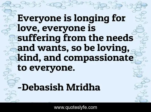 This page presents the quote "Everyone is longing for love, everyone is suffering from the needs and wants, so be loving, kind, and compassionate to everyone.". Author of this quote is Debasish Mridha. This quote is about life, love, knowledge, inspirational, intelligence, philosophy, wisdom, quotes, affection,.