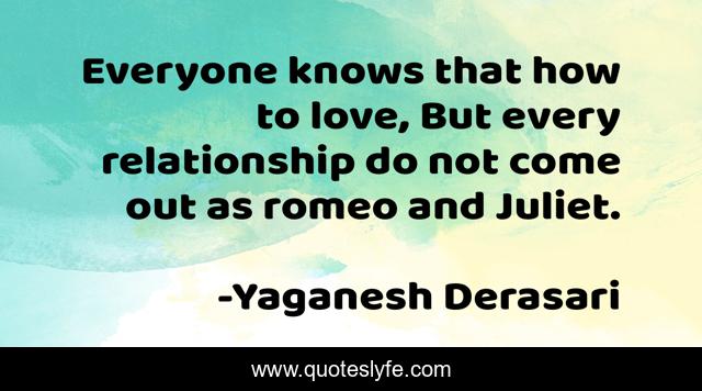 This page presents the quote "Everyone knows that how to love, But every relationship do not come out as romeo and Juliet.". Author of this quote is Yaganesh Derasari. This quote is about relationships, romeo-and-juliet, love, affection,.
