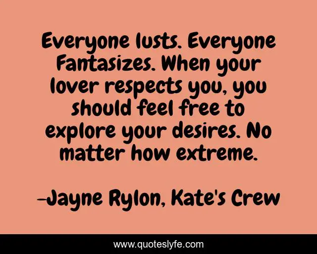 This page presents the quote "Everyone lusts. Everyone Fantasizes. When your lover respects you, you should feel free to explore your desires. No matter how extreme.". Author of this quote is Jayne Rylon, Kate's Crew. This quote is about desire, lust, fantasizing,.