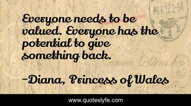 This page presents the quote "Everyone needs to be valued. Everyone has the potential to give something back.". Author of this quote is Diana, Princess of Wales. This quote is about helping, people,.