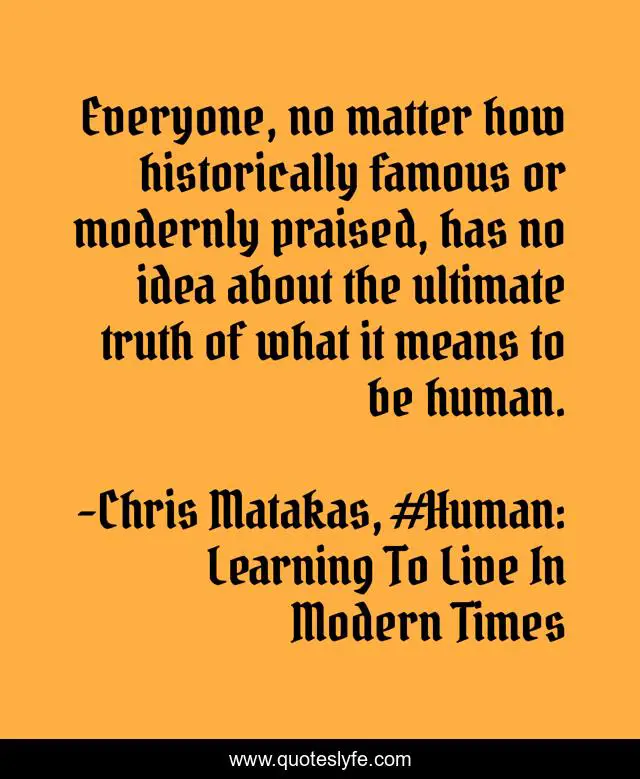 This page presents the quote "Everyone, no matter how historically famous or modernly praised, has no idea about the ultimate truth of what it means to be human.". Author of this quote is Chris Matakas, #Human: Learning To Live In Modern Times. This quote is about knowledge, human,.