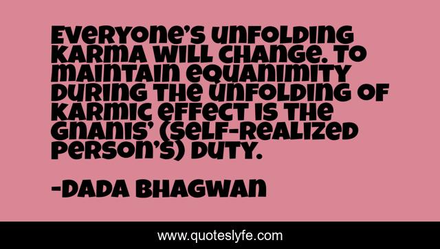 This page presents the quote "Everyone’s unfolding karma will change. To maintain equanimity during the unfolding of karmic effect is the Gnanis’ (Self-realized person’s) duty.". Author of this quote is Dada Bhagwan. This quote is about spiritual, self-realizes-person, what-gnani-does, define-unfolding-karmas, unfolding-karmas, gnani-purush,.