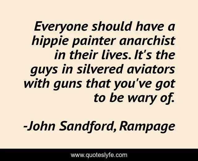 This page presents the quote "Everyone should have a hippie painter anarchist in their lives. It's the guys in silvered aviators with guns that you've got to be wary of.". Author of this quote is John Sandford, Rampage. This quote is about mgg, rampage, john-sandford, twist, michele-cook, artists, the-singular-menace, harmon,.