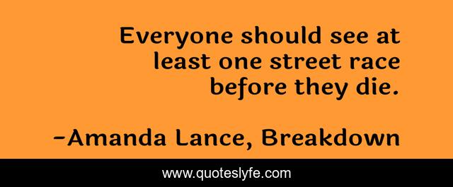 This page presents the quote "Everyone should see at least one street race before they die.". Author of this quote is Amanda Lance, Breakdown. This quote is about action, excitement, adventure,.