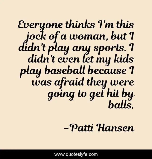 This page presents the quote "Everyone thinks I'm this jock of a woman, but I didn't play any sports. I didn't even let my kids play baseball because I was afraid they were going to get hit by balls.". Author of this quote is Patti Hansen. This quote is about play, woman, baseball,.