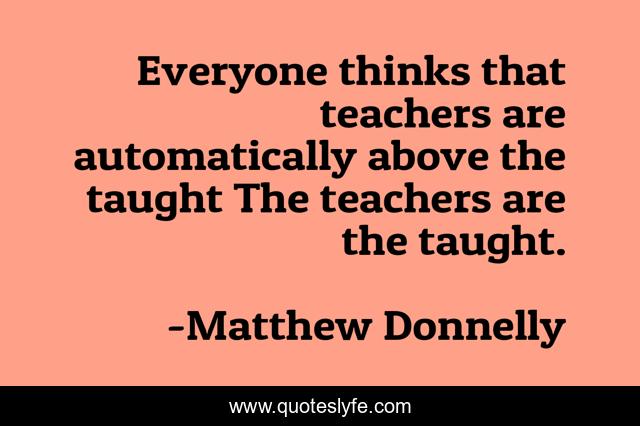 This page presents the quote "Everyone thinks that teachers are automatically above the taught The teachers are the taught.". Author of this quote is Matthew Donnelly. This quote is about teachings, taught, learning,.