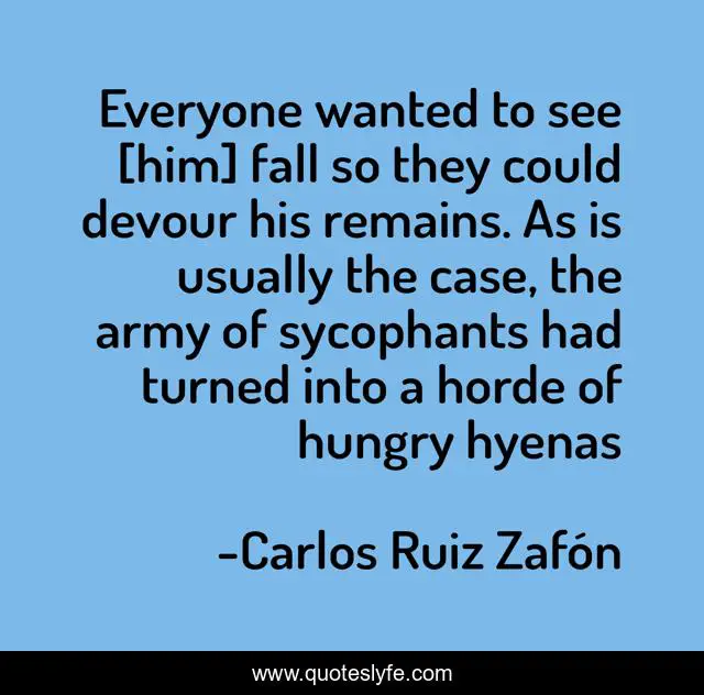 This page presents the quote "Everyone wanted to see [him] fall so they could devour his remains. As is usually the case, the army of sycophants had turned into a horde of hungry hyenas". Author of this quote is Carlos Ruiz Zafón. This quote is about two-faced, envy, backstabbers, insecurity, fake-friends, haters,.