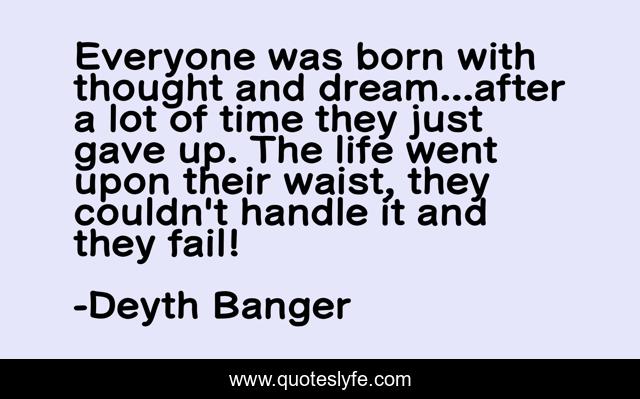 This page presents the quote "Everyone was born with thought and dream...after a lot of time they just gave up. The life went upon their waist, they couldn't handle it and they fail!". Author of this quote is Deyth Banger. This quote is about life, handle, couldn-t, fail, dream, change, dreamer,.