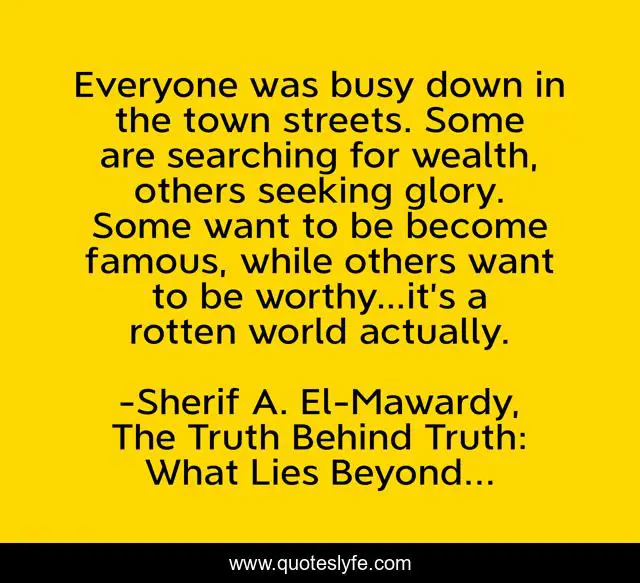 This page presents the quote "Everyone was busy down in the town streets. Some are searching for wealth, others seeking glory. Some want to be become famous, while others want to be worthy…it’s a rotten world actually.". Author of this quote is Sherif A. El-Mawardy, The Truth Behind Truth: What Lies Beyond.... This quote is about agony, life, hurt,.