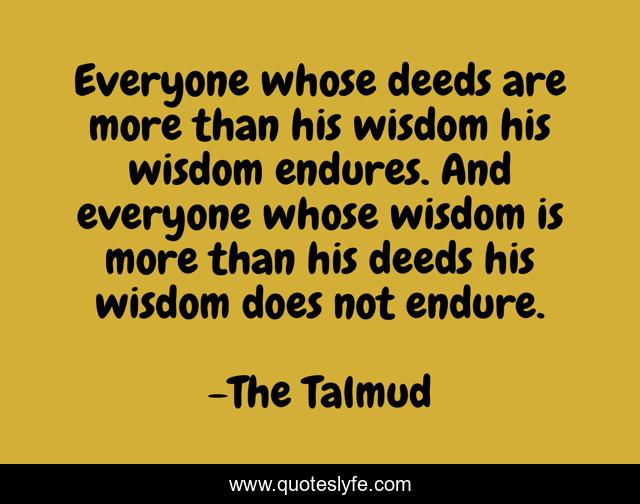 This page presents the quote "Everyone whose deeds are more than his wisdom his wisdom endures. And everyone whose wisdom is more than his deeds his wisdom does not endure.". Author of this quote is The Talmud. .