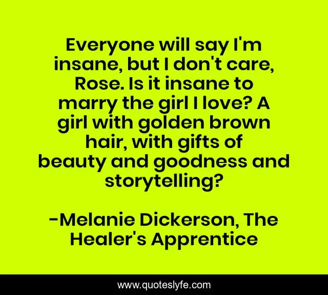 This page presents the quote "Everyone will say I'm insane, but I don't care, Rose. Is it insane to marry the girl I love? A girl with golden brown hair, with gifts of beauty and goodness and storytelling?". Author of this quote is Melanie Dickerson, The Healer's Apprentice. This quote is about insane, brown-hair, christian, storytelling, beauty, rose, marry, insanity, goodness,.