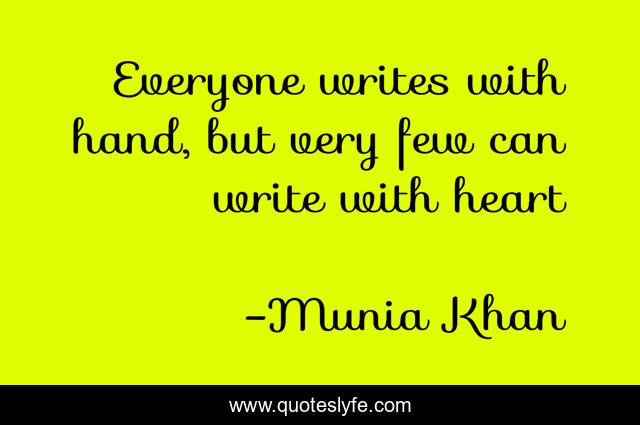 This page presents the quote "Everyone writes with hand, but very few can write with heart". Author of this quote is Munia Khan. This quote is about heart, wise-words, everyone, wise, from-the-heart, author, with, hearts, writer,.