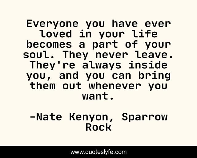This page presents the quote "Everyone you have ever loved in your life becomes a part of your soul. They never leave. They're always inside you, and you can bring them out whenever you want.". Author of this quote is Nate Kenyon, Sparrow Rock. This quote is about enthusiasm, death, love, inspirational, affection,.