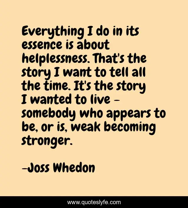This page presents the quote "Everything I do in its essence is about helplessness. That's the story I want to tell all the time. It's the story I wanted to live - somebody who appears to be, or is, weak becoming stronger.". Author of this quote is Joss Whedon. This quote is about strength-of-character, helplessness, storytelling,.