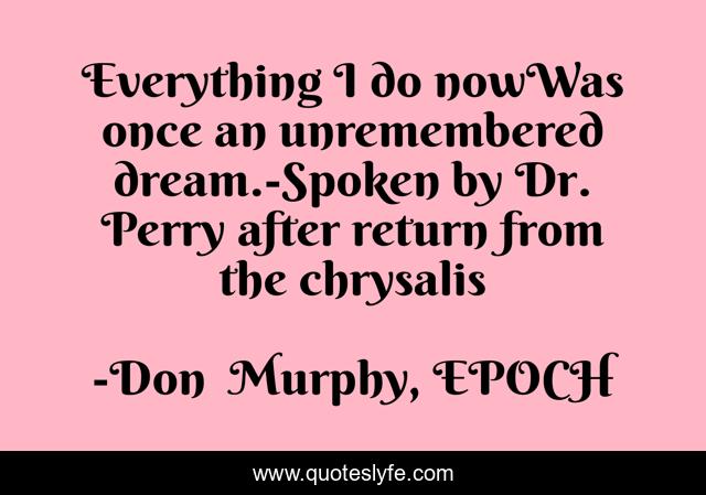 This page presents the quote "Everything I do nowWas once an unremembered dream.-Spoken by Dr. Perry after return from the chrysalis". Author of this quote is Don Murphy, EPOCH. This quote is about spacetime, science-fiction, quantum-space,.