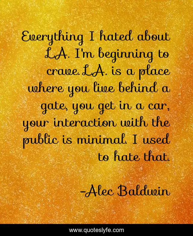 This page presents the quote "Everything I hated about L.A. I'm beginning to crave. L.A. is a place where you live behind a gate, you get in a car, your interaction with the public is minimal. I used to hate that.". Author of this quote is Alec Baldwin. This quote is about hate, live, beginning,.