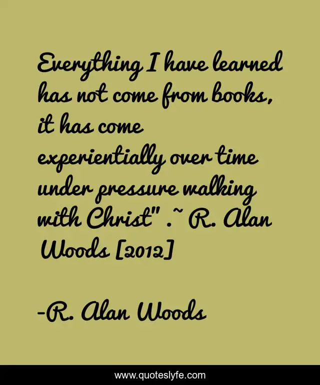 This page presents the quote "Everything I have learned has not come from books, it has come experientially over time under pressure walking with Christ".~ R. Alan Woods [2012]". Author of this quote is R. Alan Woods. This quote is about r-alan-woods, experientially, theology,.