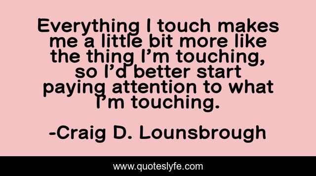 This page presents the quote "Everything I touch makes me a little bit more like the thing I’m touching, so I’d better start paying attention to what I’m touching.". Author of this quote is Craig D. Lounsbrough. This quote is about engage, self-image, reflection, invest, interact, attention, priorities, priority, self-identity,.