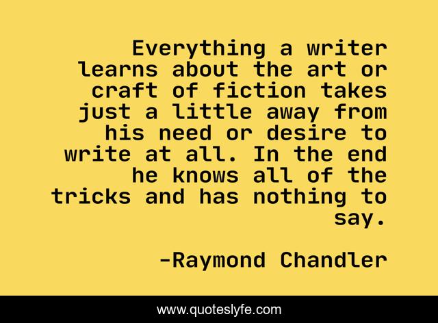 This page presents the quote "Everything a writer learns about the art or craft of fiction takes just a little away from his need or desire to write at all. In the end he knows all of the tricks and has nothing to say.". Author of this quote is Raymond Chandler. .