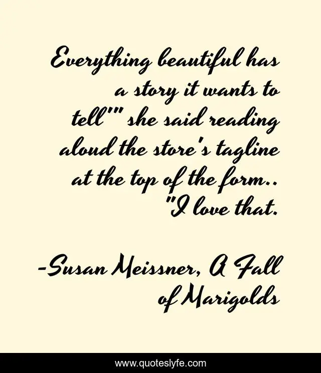 This page presents the quote "Everything beautiful has a story it wants to tell'" she said reading aloud the store's tagline at the top of the form.. "I love that.". Author of this quote is Susan Meissner, A Fall of Marigolds. .